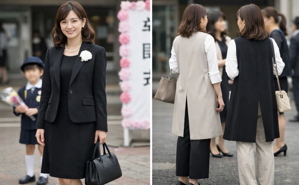 今回の卒園式では、数年前にスーツ店で購入した黒のワンピースにジャケットという、いわゆる定番スタイルで参加しました。